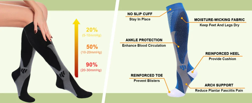 1. Improve blood circulation: Compression socks apply gentle pressure to the legs, which helps veins push blood back toward the heart more effectively and ensures muscles get oxygen-rich blood.